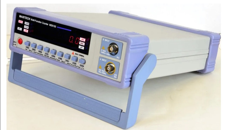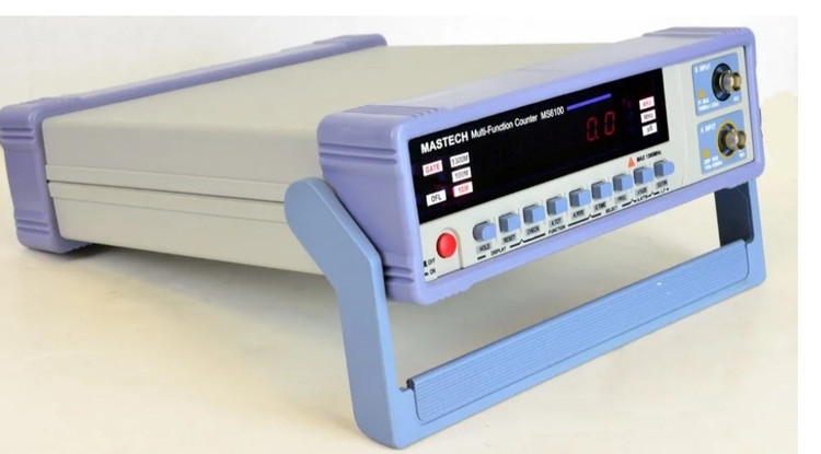 فرکانس متر رو میزی با دو کانال و نمایش تا عدد 22000 برند مستک مدل MASTECH MS6100 یک شمارنده دیجیتال چند منظوره هوشمند است. این دستگاه توسط یک میکروکنترلر 8 بیتی کنترل می شود و دارای صفحه نمایش LED هشت رقمی با نور بسیار بالا است. این دستگاه دارای چهار عملکرد اندازه گیری فرکانس، دوره زمانی، بازه کل و تست خودکار دستگاه می باشد. قابلیت اندازه گیری فرکانس در کانال A از 10 مگا هرتز تا 100 مگا هرتز و در کانال B از 10 مگا هرتز تا 1300 مگا هرتز، اندازه گیری دوره زمانی در کانال A به تنهایی از 0.1 ثانیه تا 0.1 میکرو ثانیه، بازه کل از در کانال A به تنهایی از 10 هرتز تا 10 مگا هرتز، مقادیر ورودی در کانال A حداکثر ولتاژ قابل قبول تا 250 ولت و امپدانس ورودی 1 مگا اهم و خازن کمتر از 35 پیکو فاراد و در کانال B حداکثر ولتاژ قابل قبول تا 3 ولت و امپدانس ورودی 50 اهم می باشد.فرکانس متر رو میزی با دو کانال و نمایش تا عدد 22000 برند مستک مدل MASTECH MS6100 یک ابزار کاربردی برای افرادی است که به سنجش و اندازه گیری فرکانس در محیط های مختلف نیاز دارند.